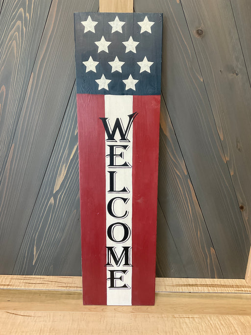 Only 1 left!Hand made and painted wood standing sign. Red, White, and Blue with Welcome in black letters. 10” x 39”