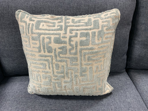 Only 3 left!Blendown throw pillow with geometric pattern upholstery fabric, blue/light gray. Welted with zipper. 17” x 17”.