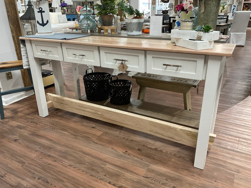 Only 1 left!Our Troy style sofa table features 4 drawers and beam at the bottom. Base is distressed in Fluff (white). Top and beam are made from wormy maple a...