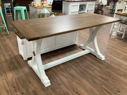 Only 1 left!Top is made with Tiger wood and clear coated. Base is poplar painted white and distressed. 73”x33”x34”. Includes matching bench 34”x11”x23”