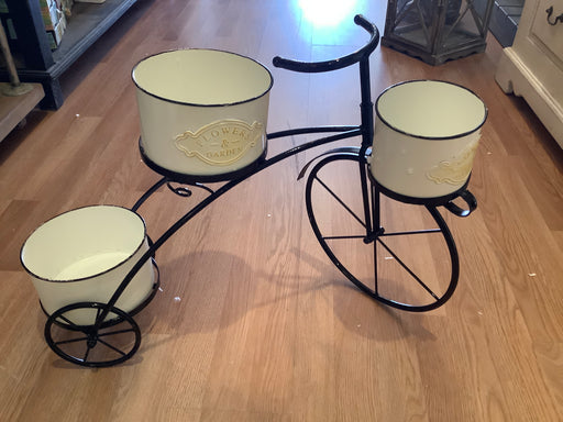 Only 3 left!Black metal tricycle with 3 white metal planters. 26”x8”x18”