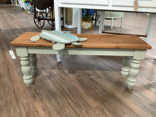 Only 1 left!Hand made wood bench. Legs are painted in Dried Sage and the top is clear coated Sapele wood. 43"x14"x17"
