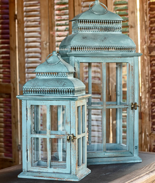 Only 1 left!Aged Verde wood window pane lantern with metal roof. Two sizes.