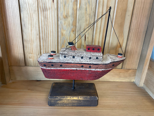Only 1 left!10” x 4” x 12” hand crafted tug boat with red and orange distressed wood and placed on a wooden stand