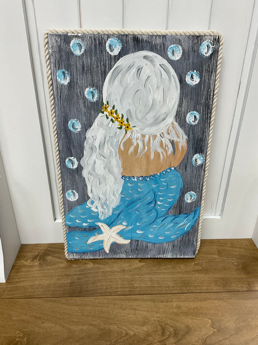 Only 1 left!Hand painted on wood with a rope trim. Blue mermaid with gray background. Includes wall hanger.. 14”x22”