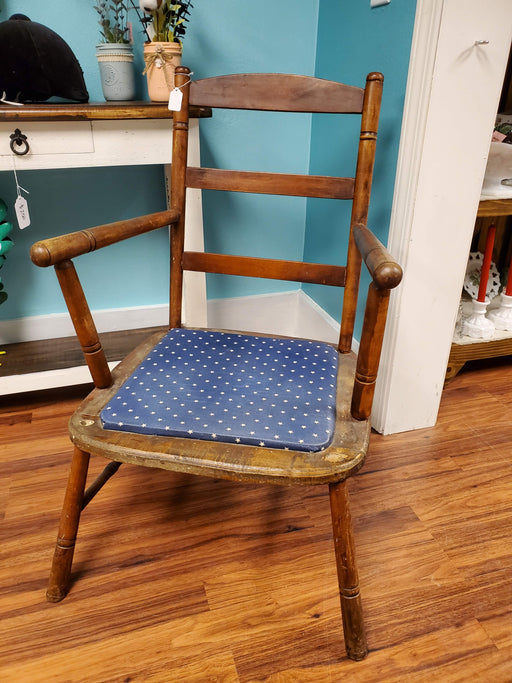 Only 1 left!Minimal line detail pine wood chair with blue seat/cushion. 22"x21"x33"