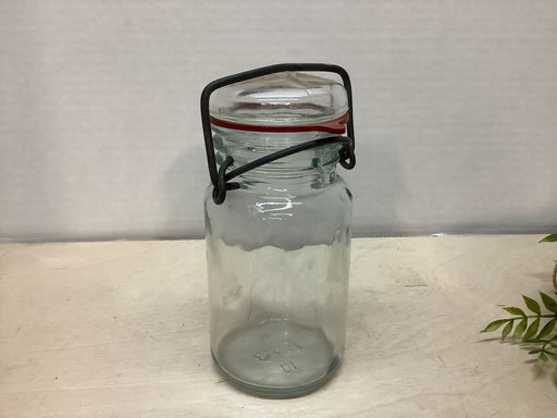 Only 1 left!Small glass jar with glass lid,rubber gasket,and metal clasp. 2.5 diameter x 5.5”