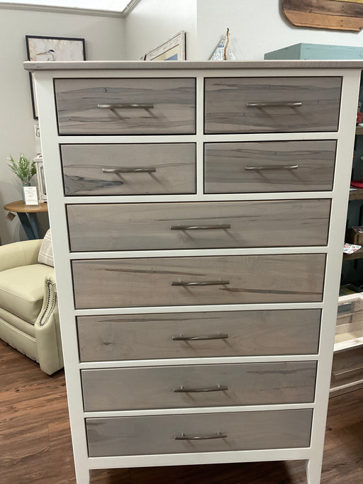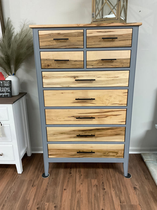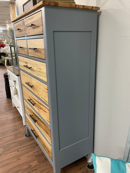 Only 1 left!Warren 9 drawer dresser design is a vertical chest of drawers. Features wormy maple top and drawer fronts in Blue Rubio and base painted in Dover W...