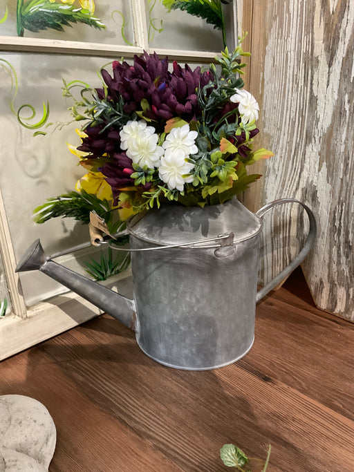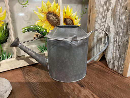 6 in stockDecorative galvanized watering can 7” round x 9” tall