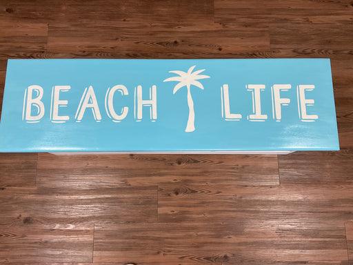 Only 1 left!Hand made and hand painted wood bench with 3 storage cubbies. “Beach Life” in white lettering on a light blue background. 48” x 14” x 18”