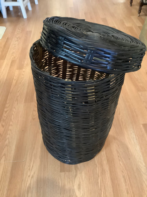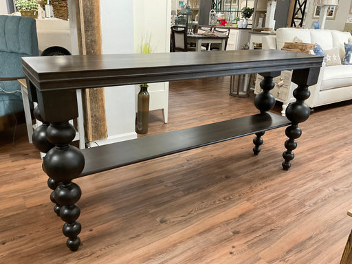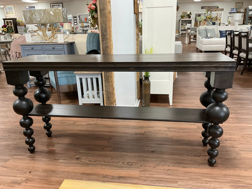 Only 1 left!Stylish round ball leg console with shelf. Solid maple wood stained black. 72”x18”x36”