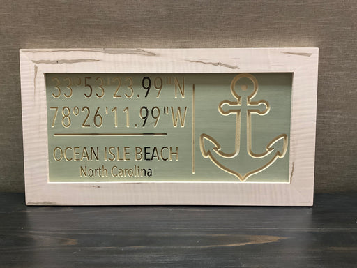 Only 1 left!Light gray/green engraved wood coordinate sign framed. Includes wall hanger. 26”x14”