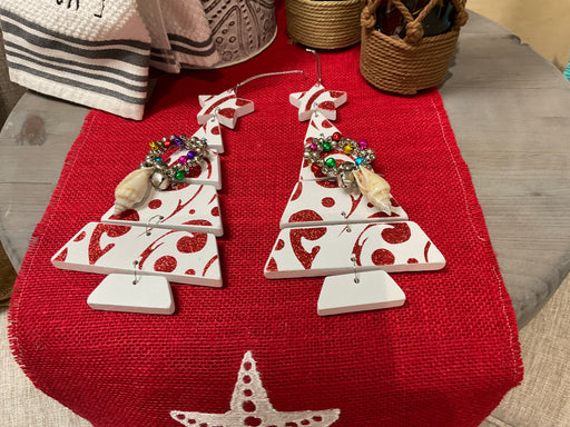 Only 4 left!Wood hanging Christmas ornament w/bells & shell - 9” x 4 1/2” - red & white