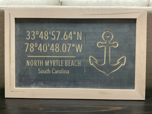Only 4 left!Light gray engraved wood coordinate sign in a wormy maple frame. Includes wall hanger. 27.5”x15”
