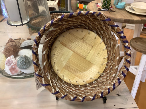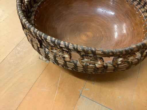 Only 1 left!Hand made with pine needles. Dark wood bowl base with pine needle trim. 11” round 5” tall