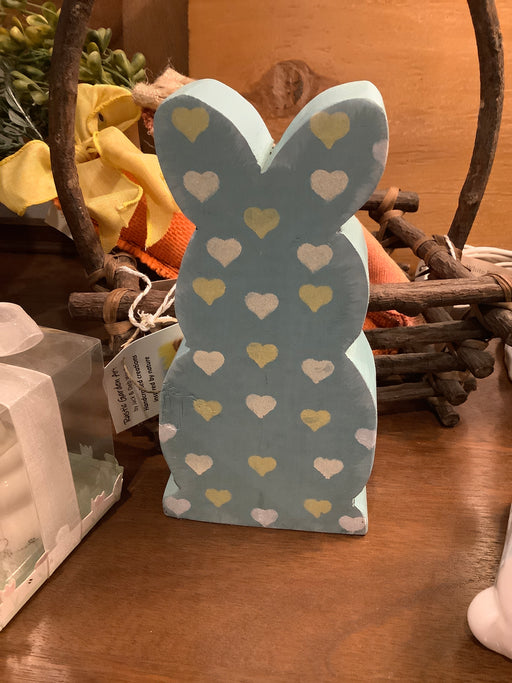 Only 1 left!Hand made wood bunny with one bent ear. Decorated with flowers and bow. 8” x 11" x 2”
