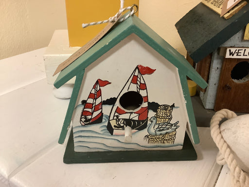 Only 1 left!Small decorative wood birdhouse with sailboats painted on the front. 5"x3"x5"