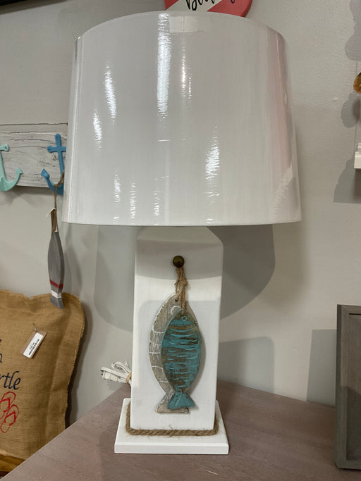 Only 1 left!Wood lamp painted white with rope trim and 2 cutout wooden fish washed in soft white and aqua finish topped with white 15 x 10” shade. 7 x 5.5 x 29”