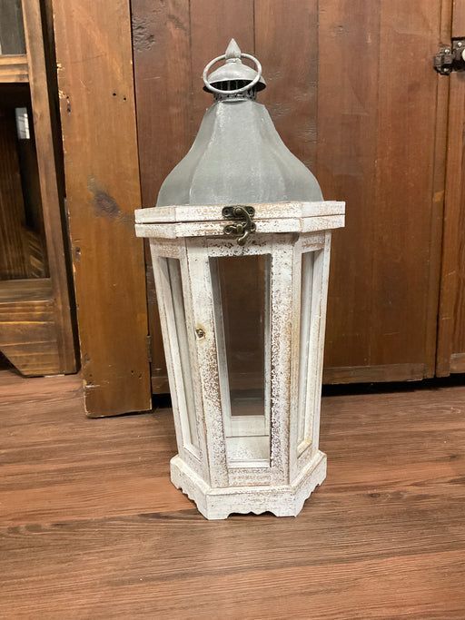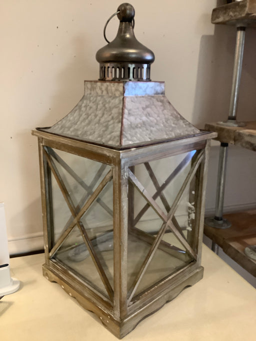 Only 2 left!Distressed wood lantern with X on the sides, glass, and metal roof. Small - 8”x8”x15” large - 11”x11”x24”