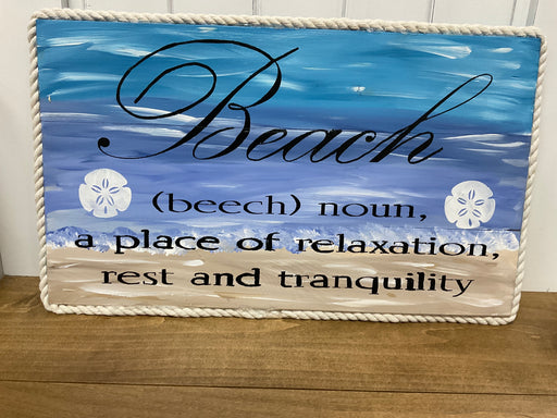 Only 1 left!Hand painted wood sign with rope trim. Blue and tan colored background with Beach definition in black lettering. Includes wall hanger. 20” x 12”