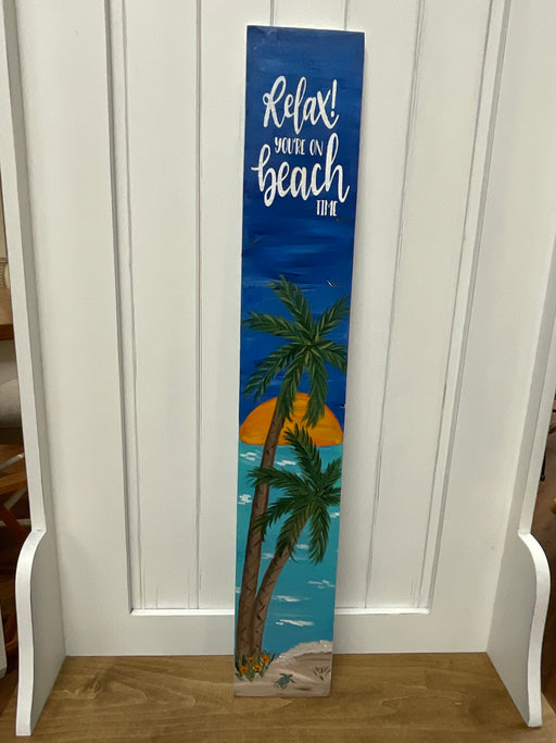 Only 1 left!Hand painted skinny wood sign. Blue background with beach and palm trees. Relax you're on the beach in white lettering. Includes wall hanger. 6”...