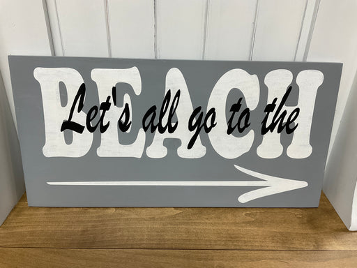 Only 1 left!Hand painted wood sign. "Let's all go to the" in black lettering with "Beach" in white lettering on gray background. Includes wall hanger. 24” x...