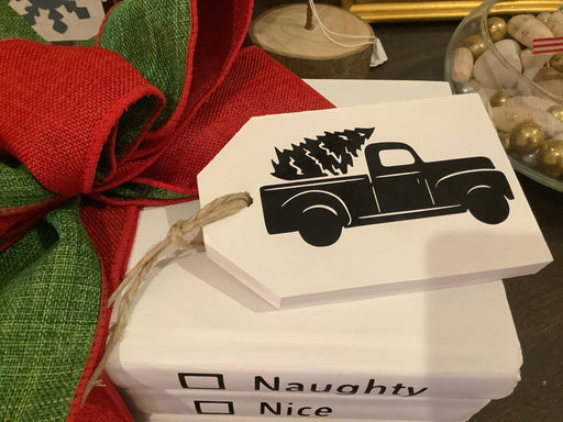 Only 1 left!Painted white wood tag with black vintage truck decal. 5”x3”