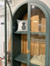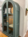 Our Lansing style display cabinet features a soft curved top with two glass doors and simple molding base. This model has a ship lap backing and two adjustable shelves. The ship lap is clear coated while the cabinet is finished in Dixie Belle Blue Grass and distressed. Champagne color handles. 42"x19"x80"