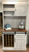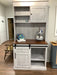 Our Rochester style wine cabinet is a one piece hutch with sliding barn door.  This model features an open and closed storage hutch with a wine rack base and storage cabinet.  Finished in a white and gray glaze with stained maple top, GF light brown dye with DB golden ash.  43"x22"x 85"