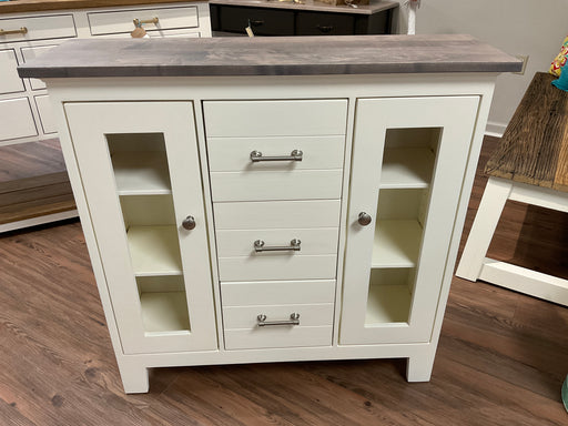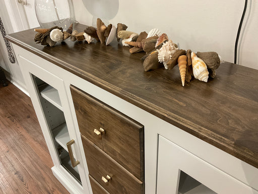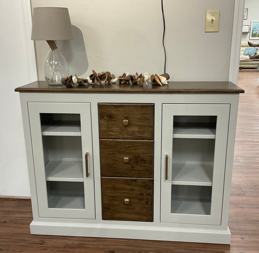 Only 1 left!Our Wallstreet style buffet features two glass doors with a column of three drawers in the middle. Base is painted in whitetail, maple wood top is...