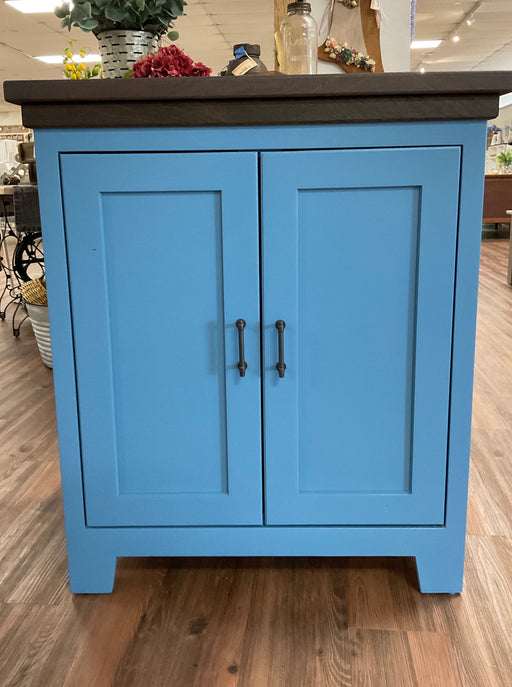 Only 1 left!Our Novi style cabinet design features inset doors and open leg base. Finished in a custom blue with one adjustable shelf. The Sapele top is roug...