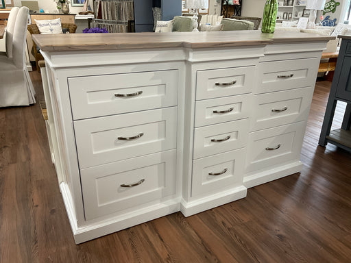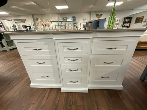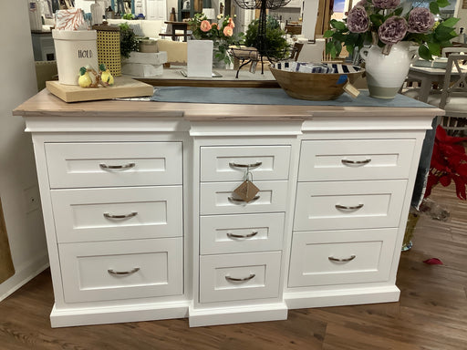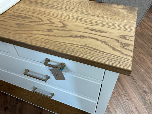 Only 1 left!Poplar wood base painted in Dover White with 7 dove tail drawers and champagne bronze hardware. Oak wood top and bottom shelf stained in Rubio cash...