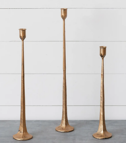 Only 1 left!Tapered candle holders in gold hammer finish. Three sizes.