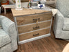 Our Holland dresser is a shorter 3 drawer dresser with a wood top and matching wood face drawer fronts. This model has a trimmed base finished in a custom silver plate slate tile paint. Wormy maple top and fronts are cleared w/GF flat out flat. Soft close drawers with standard black hardware 34” x 19” x 27.5”
