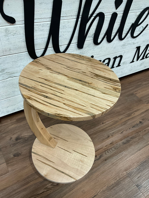 Only 2 left!Our Flat Rock end table is a multi purpose TV Tray. This model is made with wormy maple wood. All tables are cleared MCK. 16” round x 24” tall
