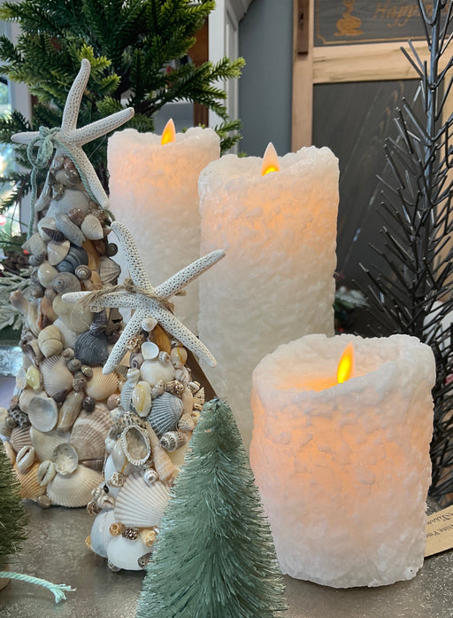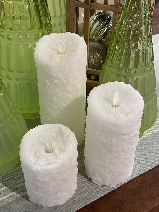 Only 5 left!White bumpy LED pillar candle with moving flame in 3 sizes. Also includes timer.