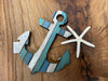 Hand crafted and painted wood anchor.  Painted in white, turquoise and blue stripes, distressed. 9”x11”