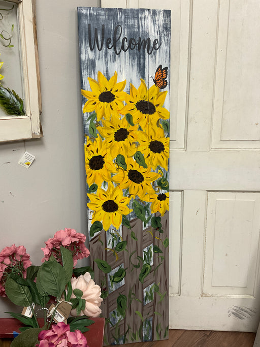 Hand made and painted wood door panel.  Painted with bright yellow sunflowers behind a fence, welcome and butterfly.  14"x57"