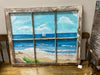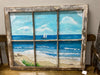 A beautiful hand painted beach scene with sailboat on repurposed 6 Pane window. Wall hanger included. 34"x28"