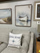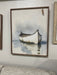 White boat on the water. Natural walnut frame with inset printed coastal inspired design.  24”x30”. Includes wall hanger.