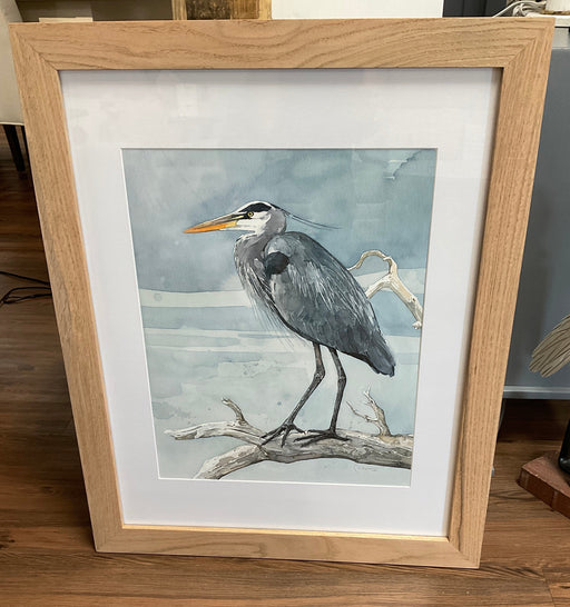 Only 1 left!Framed watercolor print, blue heron, in a natural oak wood frame. Includes wall hanger. Overall size 25” x 31”