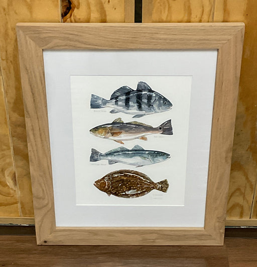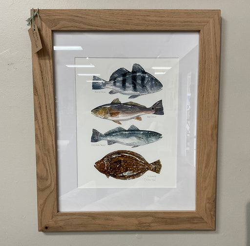 Only 1 left!Watercolor print of a variety of fish, flounder, black drum, red drum and speckled trout in a natural oak wood frame with mat. Overall size 19” x 23”