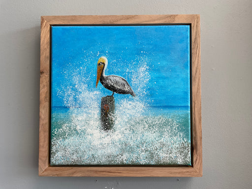 Only 1 left!Local artist acrylic painting of a pelican on a pier post with waves splashing. Handmade Oak wood floating frame. 14”x2”x14”