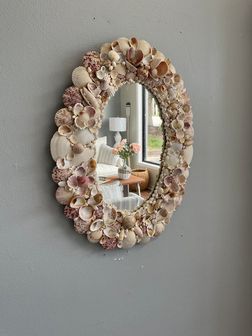 Only 1 left!Oval shaped mirror hand decorated with seashells. 13” x 16.5”