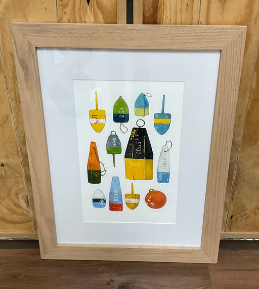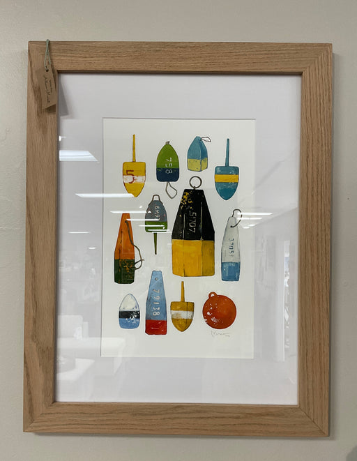 Only 1 left!Watercolor print of buoy's in different shapes, sizes, and colors. Framed in a natural oak wood frame with a mat. Overall size 21” x 27”