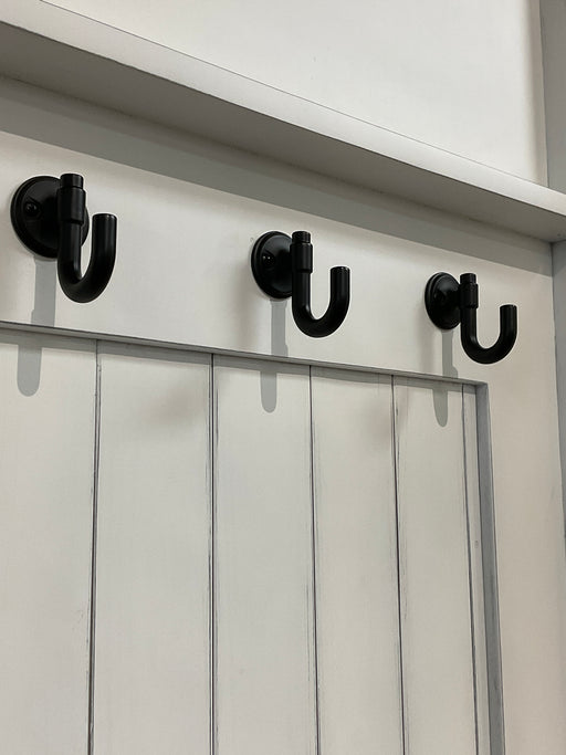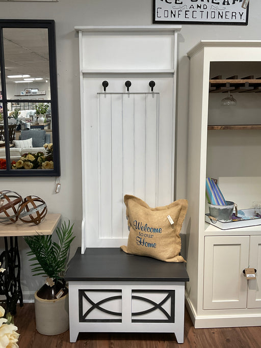 Only 1 left!Single seat hall tree features under seat storage and 3 black hooks. Finished in cotton white and distressed. Dark stained seat and decorative in...
