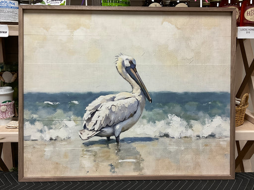 Only 1 left!Pelican in the tide. Natural walnut frame with inset coastal inspired design. 30” x 24”