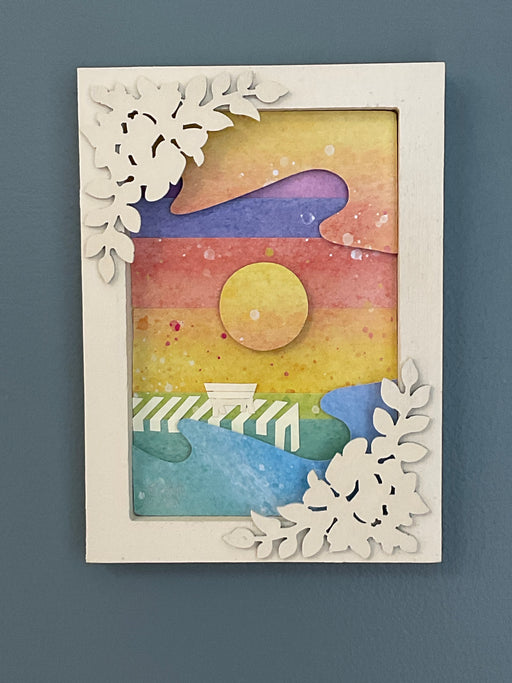 Only 1 left!Handmade from hand cut card stock paper and secured in decorative wood frame. Cutout picture of a bench for two on the dock during sunset, in vibr...