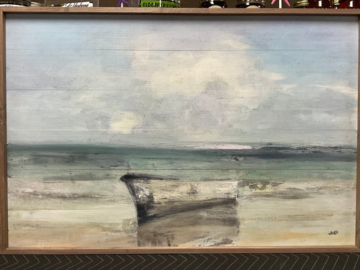 Only 1 left!Wooden boat on the beach. Natural walnut frame with inset printed coastal inspired design by Julia Purinton. 36” x 24”