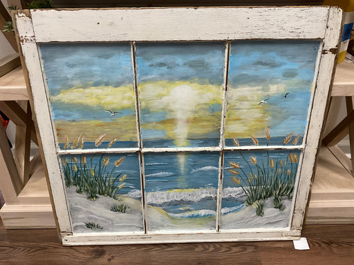 In stockBeautiful beach scene with sun hand painted on vintage window in various colors 32” x 28”